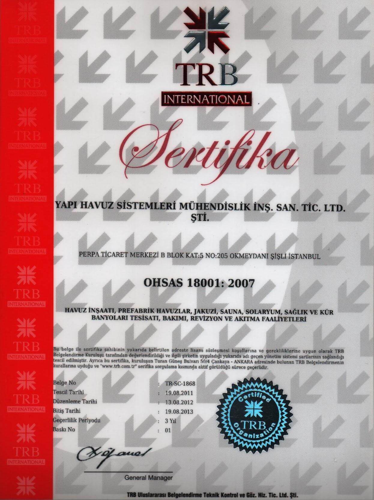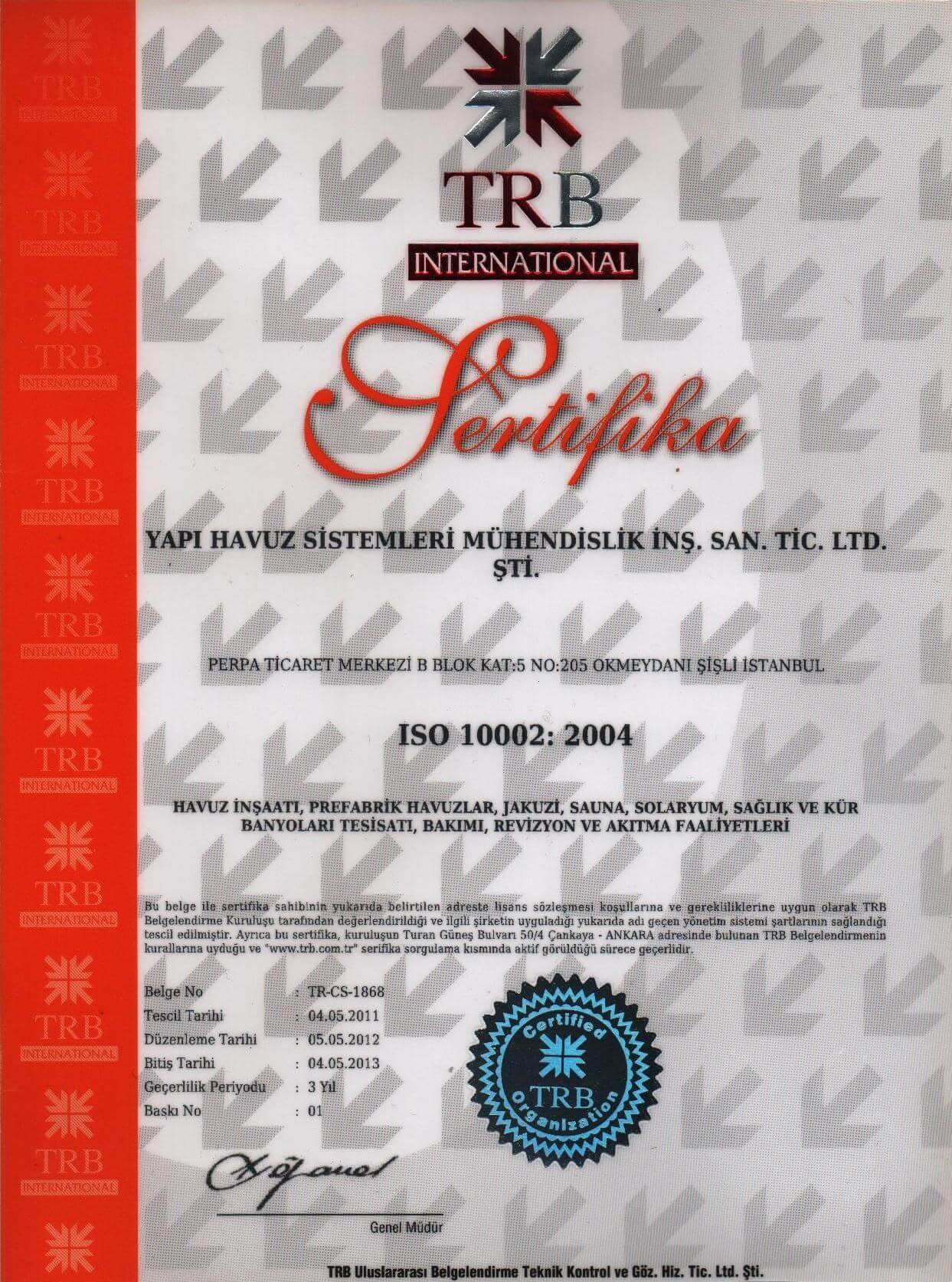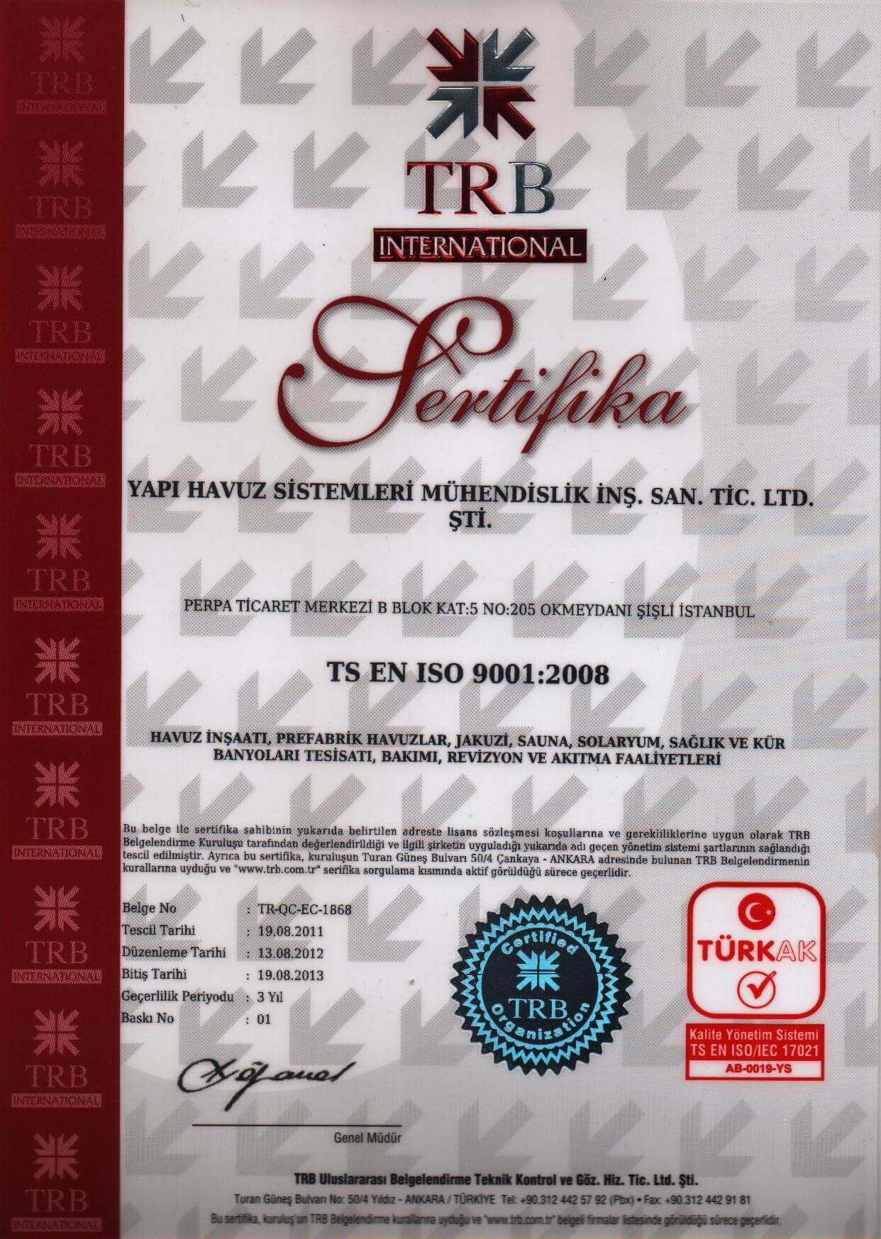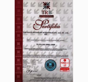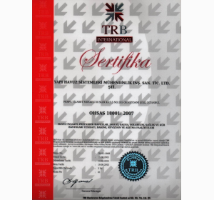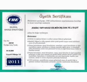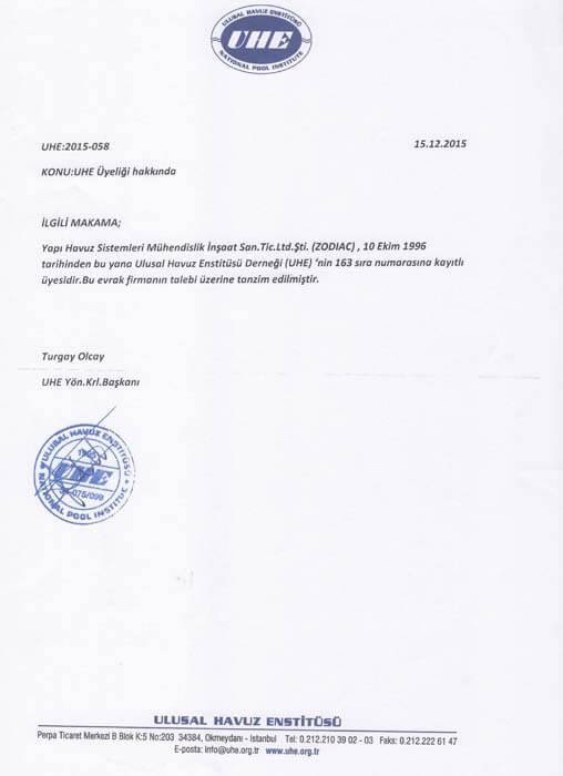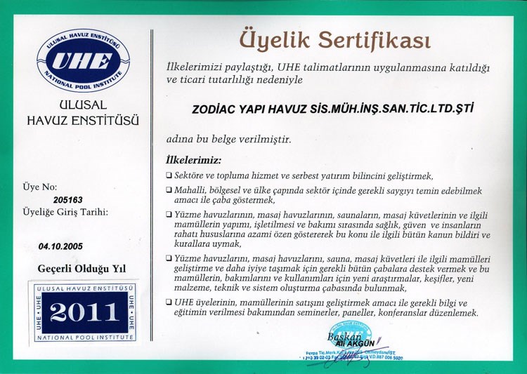 Firmamız, tüm havuz, sauna, jakuzi vb. sektörü firmaların uygulama standartlarını sağlayan ve denetleyen Ulusal Havuz Enstitüsü Derneğinin (UHE) sertifikasını 1996 yılından buyana alarak kalite anlayışı tescilledi. Ayrıca ISO 9001 kalite yönetim sertifikası, ISO 14001 Çevre yönetim sertifikası, CE belgesi, OHSAS 18001 iş sağlığı güvenliği sertifikası, TS EN ISO 10002 kalite yönetimi – müşteri memnuniyeti sertifikaları ile kalite tescilimiz güçlendi.