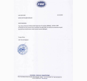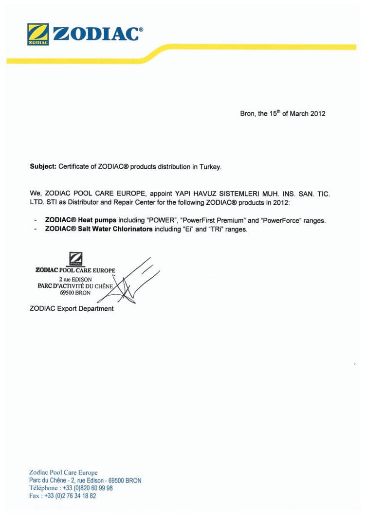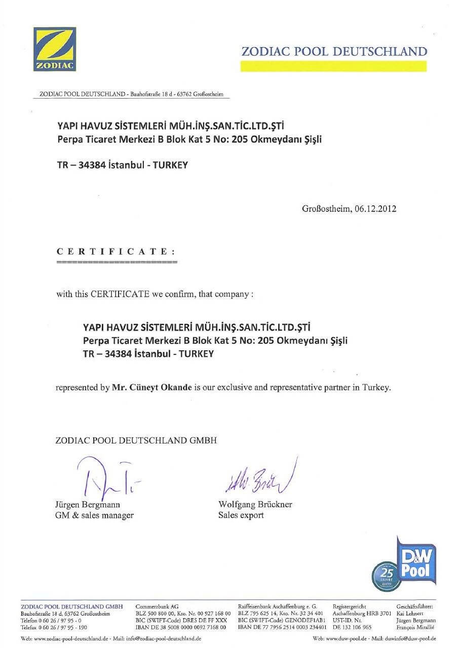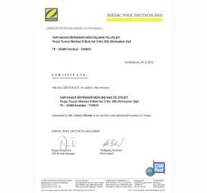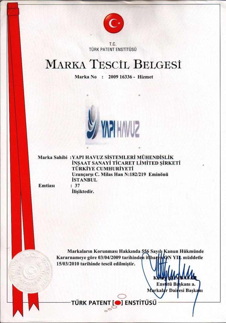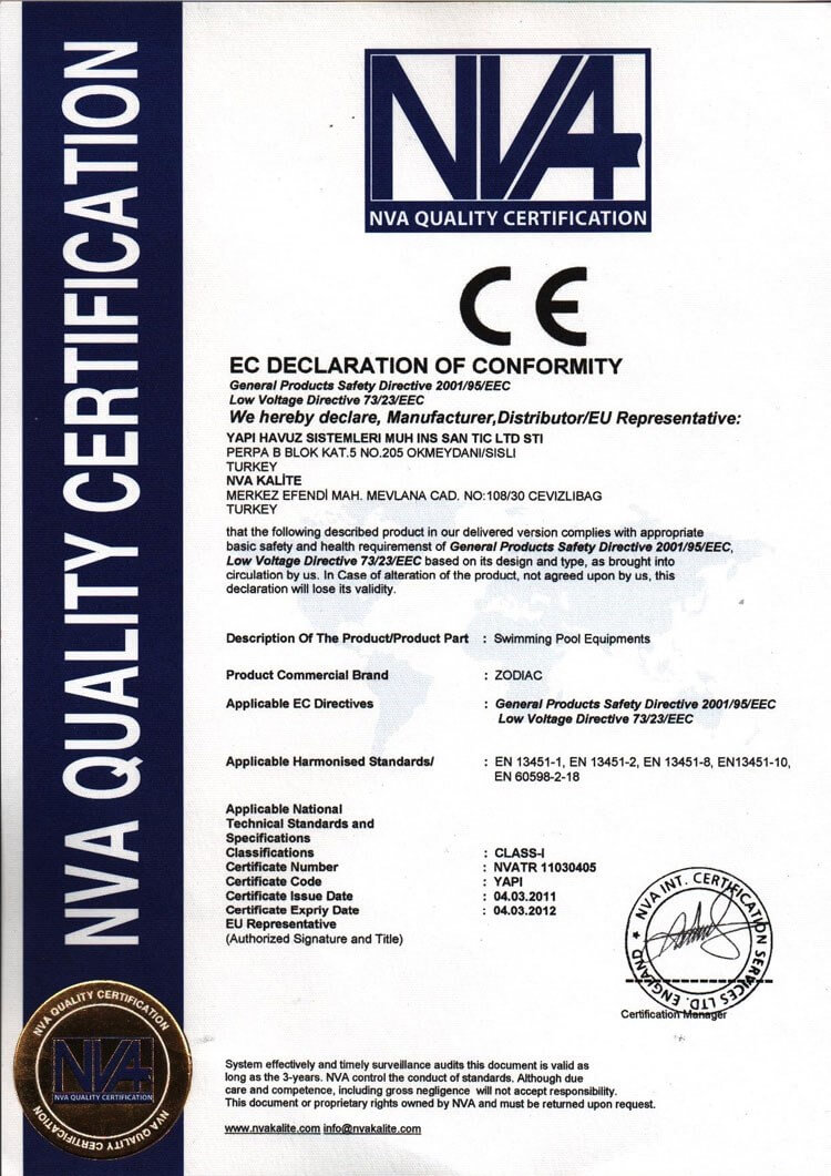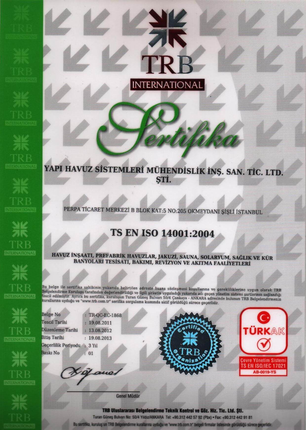 Firmamız, tüm havuz, sauna, jakuzi vb. sektörü firmaların uygulama standartlarını sağlayan ve denetleyen Ulusal Havuz Enstitüsü Derneğinin (UHE) sertifikasını 1996 yılından buyana alarak kalite anlayışı tescilledi. Ayrıca ISO 9001 kalite yönetim sertifikası, ISO 14001 Çevre yönetim sertifikası, CE belgesi, OHSAS 18001 iş sağlığı güvenliği sertifikası, TS EN ISO 10002 kalite yönetimi – müşteri memnuniyeti sertifikaları ile kalite tescilimiz güçlendi.